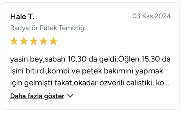 Kombi Petek Temizliği (Yıkama): Isınma performansını düşüren kireç, tortu ve çamurlaşmayı modern makine ve teçhizatlarımızla temizliyoruz. Nizami çalışma prensibimizle, tesisatınızdaki sirkülasyonu optimize ederek faturanızda tasarruf, evinizde maksimum ısı sağlıyoruz.